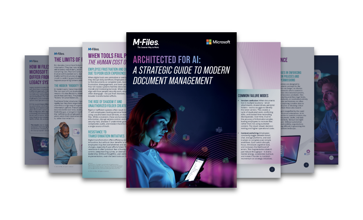 Organizations depend on Microsoft 365 for collaboration and communication, yet scattered content, manual processes, and disconnected systems continue to slow work down and increase compliance risk. Architected for AI: A Strategic Guide to Modern Document Management shows how M-Files strengthens the Microsoft 365 environment by unifying information, automating governance, enriching metadata, and preparing connected data for AI. The result is faster workflows, improved visibility, fewer routine tasks, and stronger security and compliance across the business.
